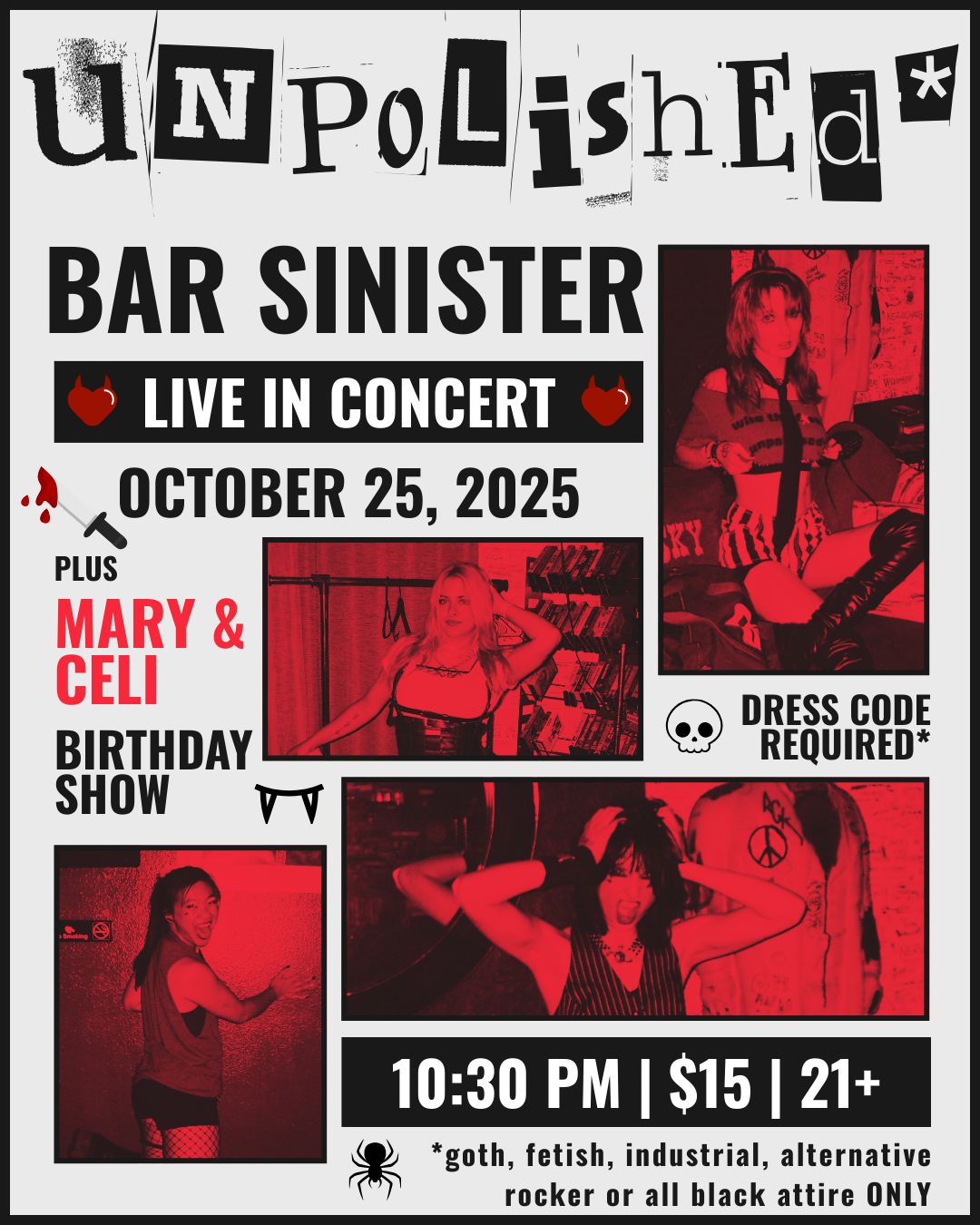 $15 Admission - Every SATURDAY upon Your Arrival in...Goth, Fetish, industrial, Alternative rocker or all black attire! No shorts, blue jeans, flip flops, flannel, white sneakers, sports attire or street or beach clothes!!). Sorry no exceptions.